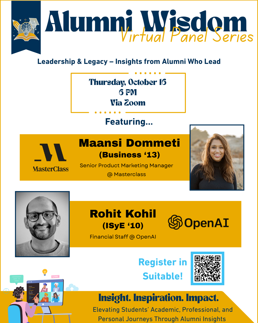 The October alumni panel will focus on the following topics:
