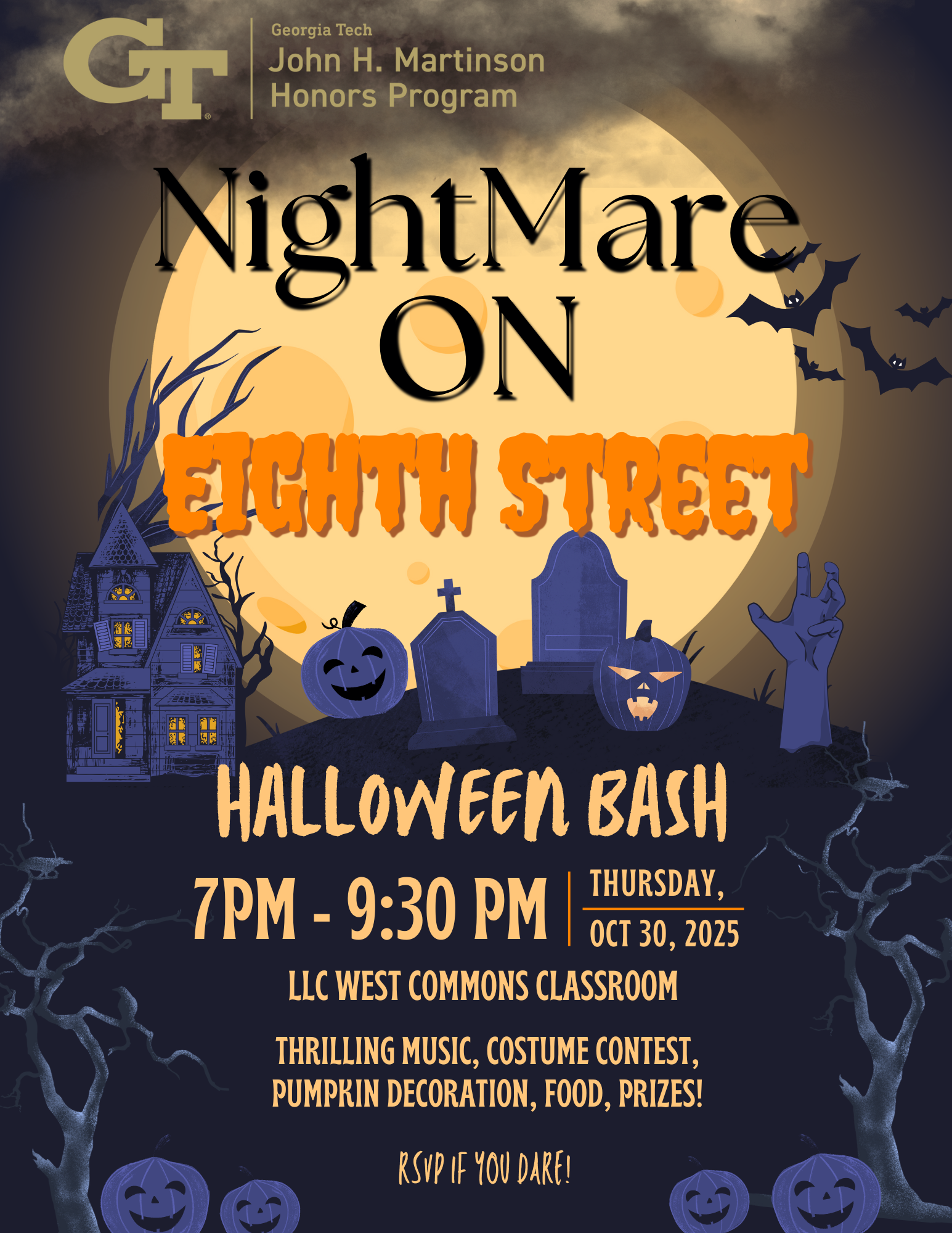 Join the Honors Leadership Council's Community Building committee for a night of thrilling music, costume contests, pumpkin decoration, food, and prizes. We will be in the LLC West Commons Classroom on Thursday, October 30th from 7:30pm - 9:30pm. RSVP... if you dare!